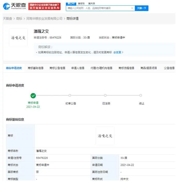 中国经济周刊-经济网讯天眼查App显示,近日“潘嘎之交”相关商标陆续被多家公司申请注册,申请人包括河南华粮农业发展有限公司、北碚区安余沫文化传媒工作室等,国际分类涉及酒、广告销售等,商标状态均为“商标申请中”。